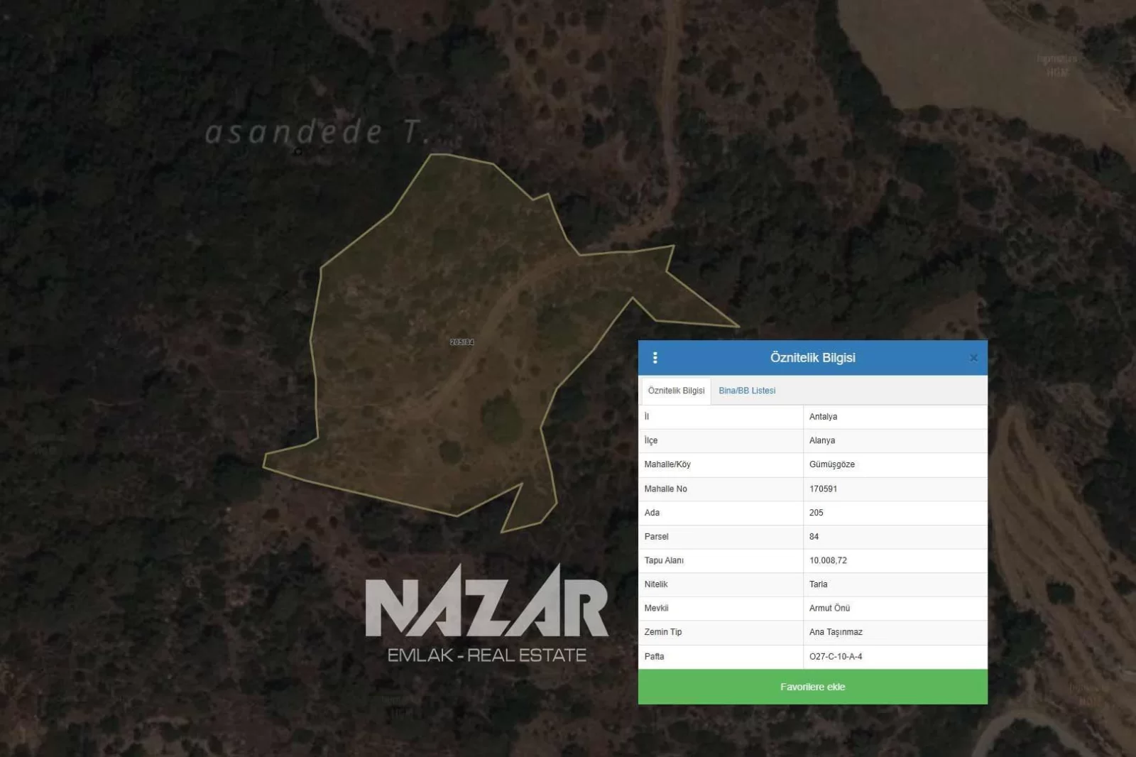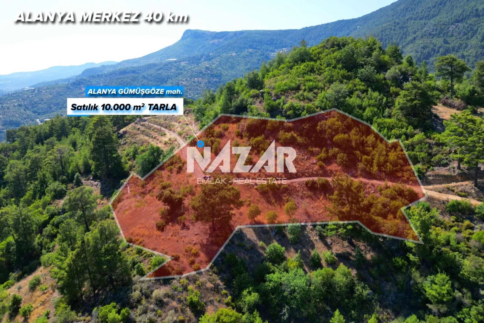 10.000 m2Alanya Gümüşgöze Mahallesi’nde, 205 ada 84 parselde yer alan 10.000 m² büyüklüğündeki bu tarla satışa sunulmuştur. Alanya merkeze 35 km mesafede bulunan arazi, köy yerleşim alanı içerisinde yer almakta olup sondajla kuyu açma imkânı bulunmaktadır. Ayrıca başka bir parselde ortak kullanım su kaynağı da mevcuttur.