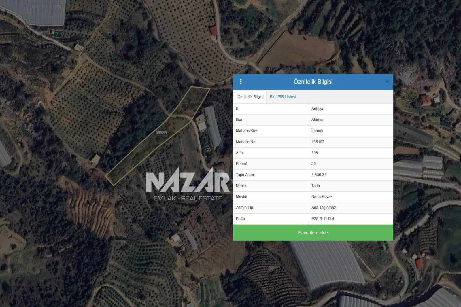 4.530 m2Alanya İmamlı Mahallesi’nde yer alan 4.530 m² genişliğindeki bu tarla, Alanya merkeze yaklaşık 35 km mesafede konumlanmaktadır. 105 ada 20 parsel tapu bilgisine sahip olan tarla köy yerleşim alanı içerisinde bulunmakta olup harfiyatsızdır. Çevresi seralar ve ekili tarım arazileri ile çevrili olup tarımsal faaliyetler için oldukça elverişlidir. Denize 4 km.