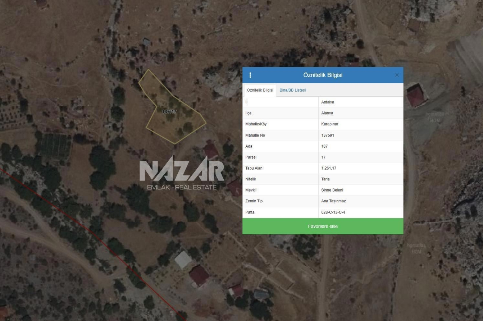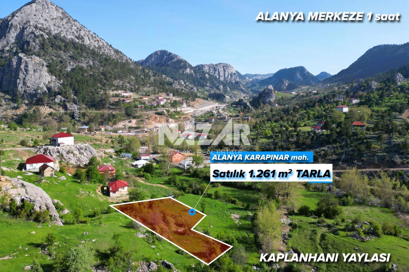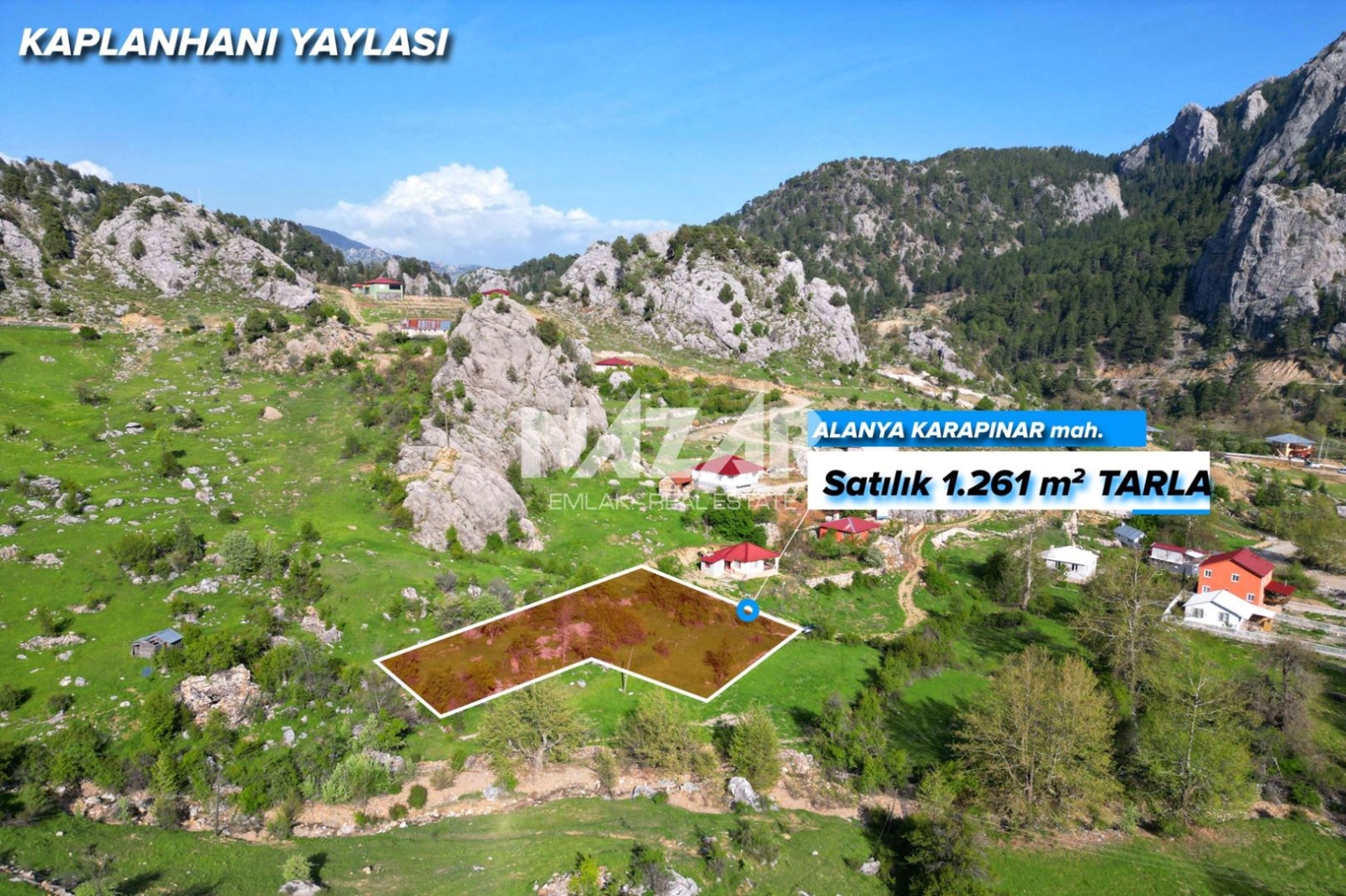 1.261 m2Alanya Karapınar Mahallesi sınırlarında, Kaplananı Yaylası mevkiinde yer alan bu 1.261 m² büyüklüğündeki tarla, 187 ada 17 parsel tapu bilgilerine sahiptir. Alanya şehir merkezine yaklaşık 45 km uzaklıkta yer almakta olup, yol, su ve elektrik altyapısı mevcuttur.