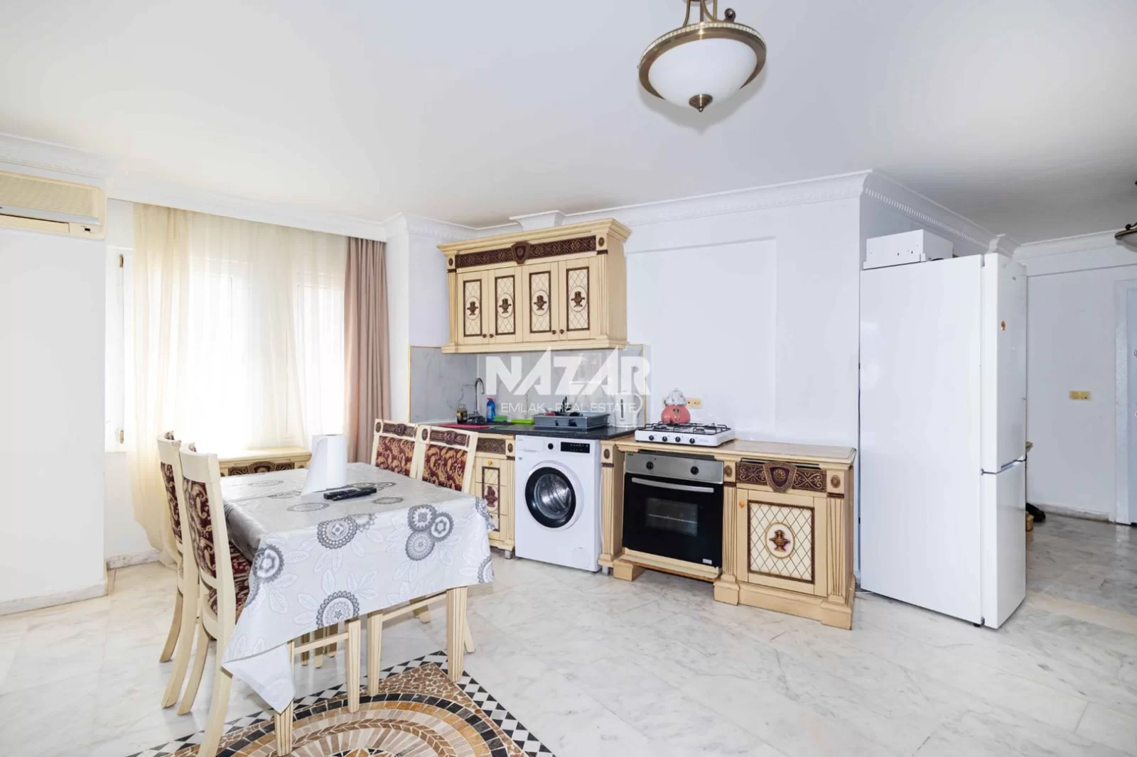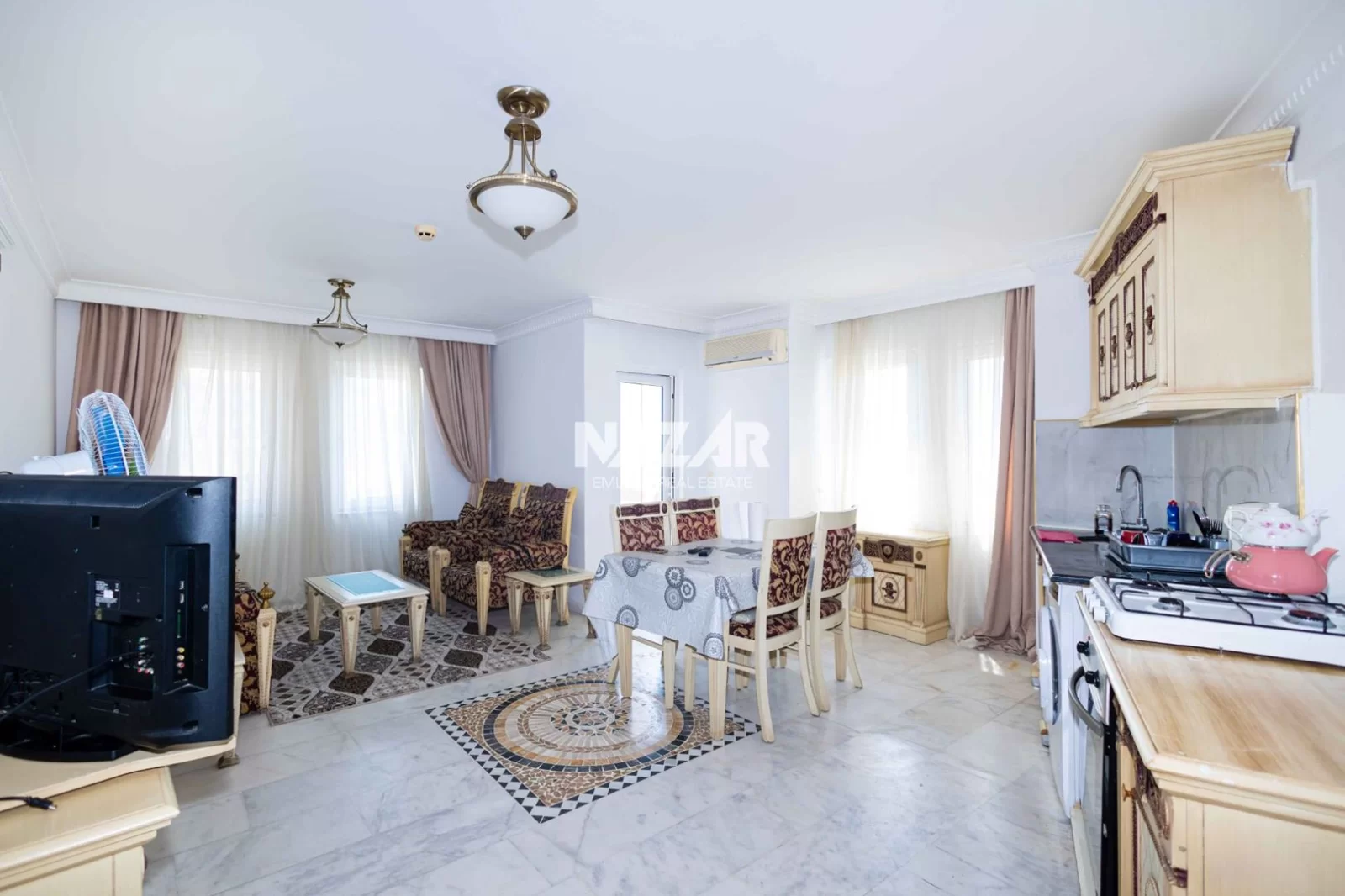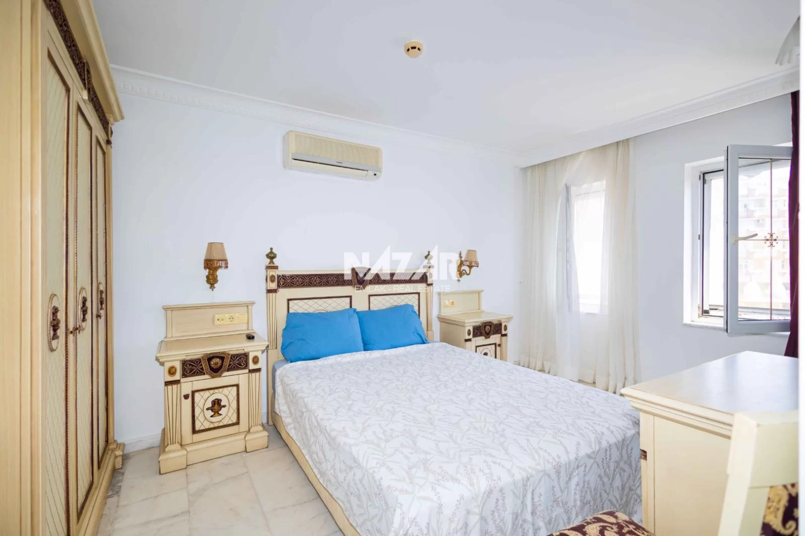 5Alanya Kestel Mahallesi’nde yer alan bu eşyalı daire, deniz, kale ve Alanya manzarasına sahiptir. 85 m² genişliğinde olan daire, 2 yatak odası, açık mutfaklı salon, duşakabinli banyo ve deniz manzaralı balkondan oluşmaktadır. Barok ve klasik tarzda döşenmiş mobilyaları temiz ve kullanışlıdır. Doğu ve güney cepheli daire, 7 katlı binanın 5. katında yer almaktadır.