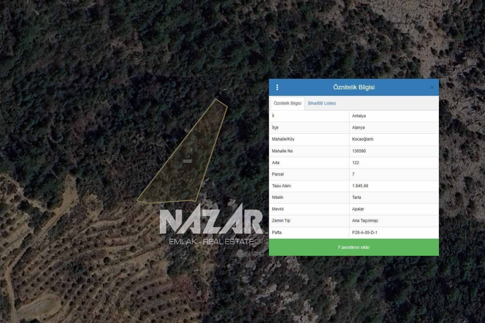 1.845 m2Alanya şehir merkezine yaklaşık 30 km mesafede bulunan Kocaoğlanlı Mahallesi’nde yer alan bu 1.845 m² büyüklüğündeki tarla, doğa manzarasına sahip olup yatırım ve tarımsal kullanım için uygundur. Köy yerleşim alanına yakın konumda bulunan arazi az eğimli yapısıyla kullanım kolaylığı sunmaktadır.