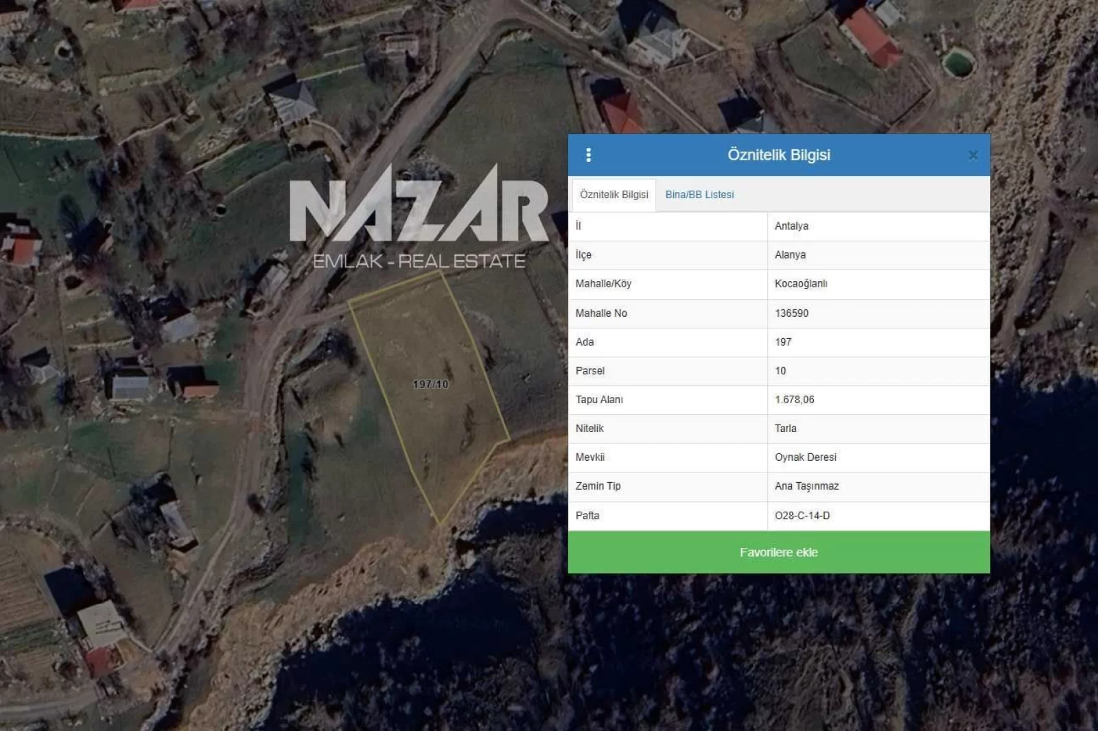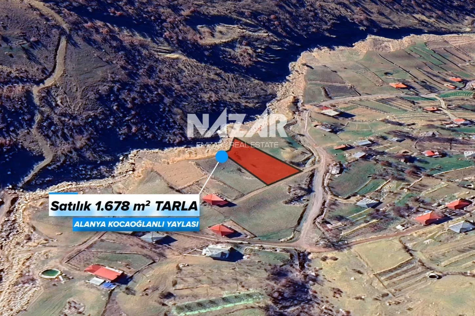 1.678 m2Alanya şehir merkezine 50 km mesafede bulunan, Kocaoğlanlı yaylasındaki, 1.678 m² büyüklüğündeki bu tarla, köy yerleşim alanı içerisinde yer almakta olup düz arazi yapısına sahiptir. Doğa manzaralı konumuyla yatırım ve tarımsal kullanım için uygundur. Tapu bilgileri 197 ada 10 parsel olarak kayıtlıdır.