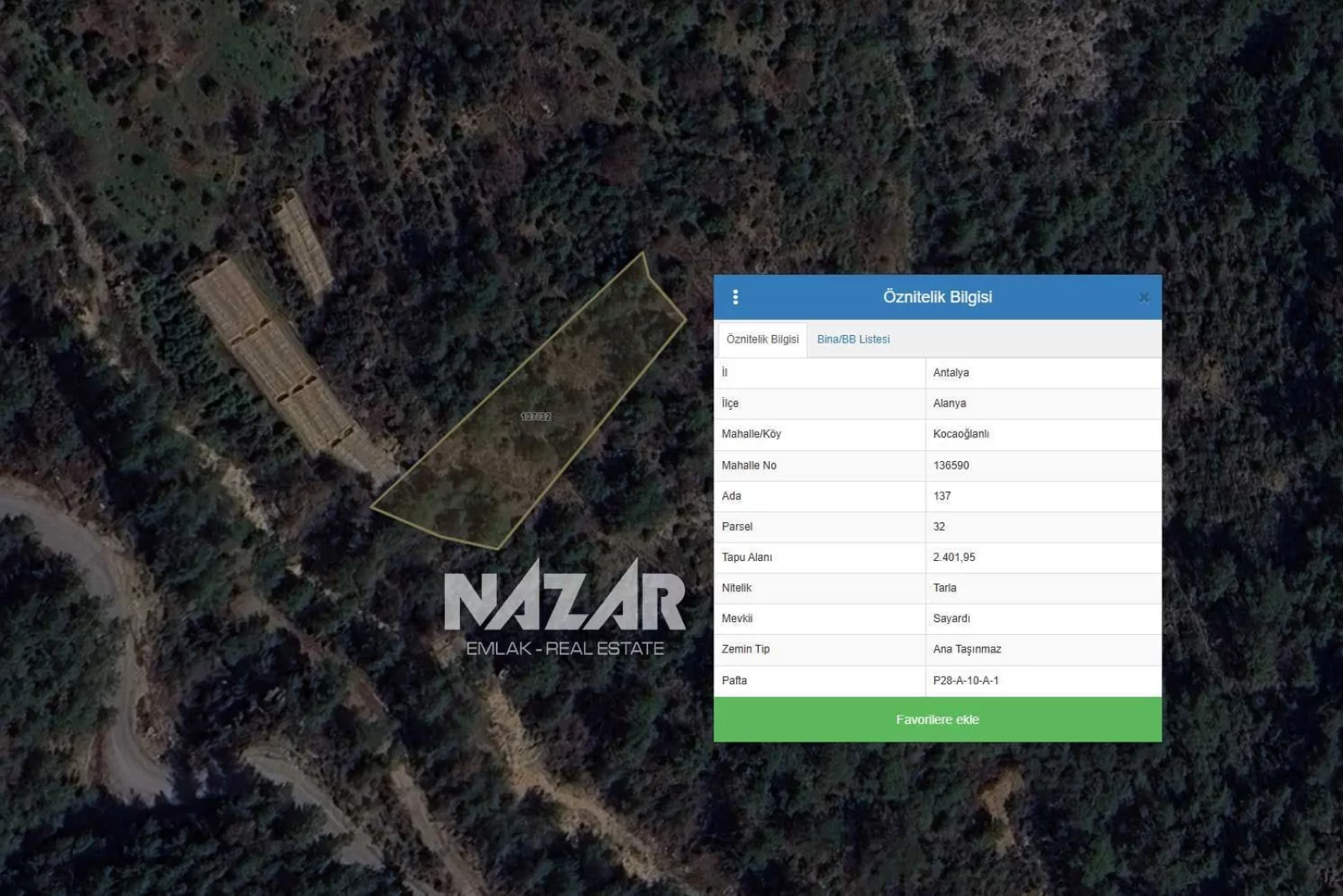 Tapu bilgileri 137 ada 32 parsel olarak kayıtlıdır. Elektrik ve su abonesi alınabilir, çevresinde 600 metre mesafede yerleşim alanı bulunmaktadır. Bu araziye Nazar Emlak aracılığıyla ulaşabilirsiniz.