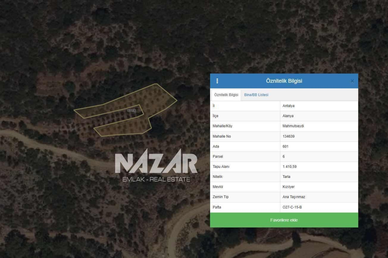 1.411 m2Alanya Mahmutseydi Mahallesi’nde, şehir merkezine yalnızca 17 km mesafede yer alan 1.411 m² büyüklüğündeki tarla satışa sunulmuştur. 601 ada 6 parsel tapu bilgilerine sahip olan arazimiz, anayola yakın, köy yerleşim yerine komşu ve az eğimli yapısıyla hem tarımsal kullanım hem de yatırım amacıyla değerlendirilebilir.