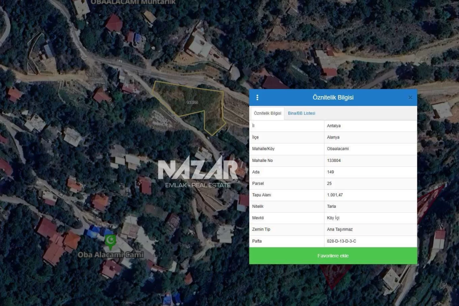 1.002 m2Alanya şehir merkezine 15 km mesafede, köy turizmiyle öne çıkan Obaalacami Köyü’nde yer alan 1.002 m² genişliğindeki bu tarla satılıktır. Tapu bilgileri 149 ada 25 parsel olarak kayıtlıdır. Köy yerleşim alanı içinde yer aldığı için villa tipi konut yapımına uygundur. Vadi ve doğa manzarasına sahip konumuyla yatırım için ideal bir fırsattır.