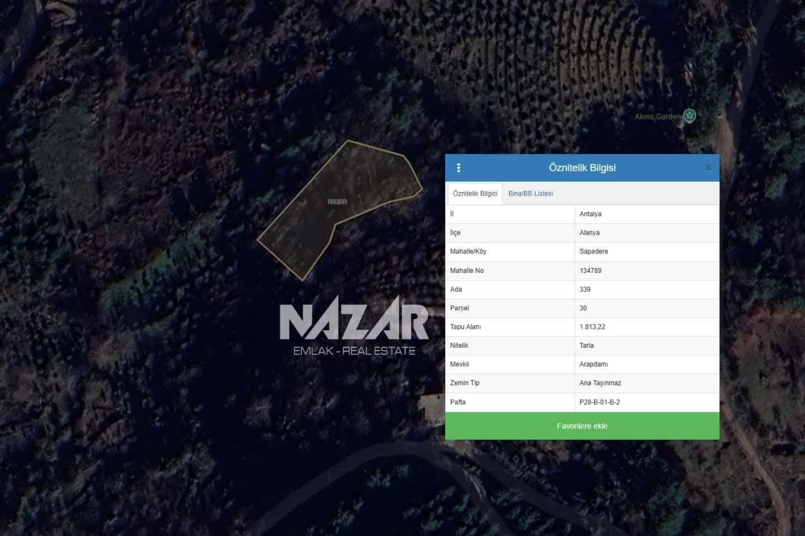 1.813 m2Alanya Sapadere Mahallesi’nde yer alan 1.813 m² büyüklüğündeki tarla satılıktır. Alanya merkeze yaklaşık 40 km mesafede bulunan taşınmaz 339 ada 30 parsel tapu bilgisine sahiptir. Köy yerleşim alanı içerisinde yer alan arazi düz yapıda olup hafriyatsızdır ve doğal yapısını korumaktadır. İçerisinde pelit ağaçları bulunmaktadır.