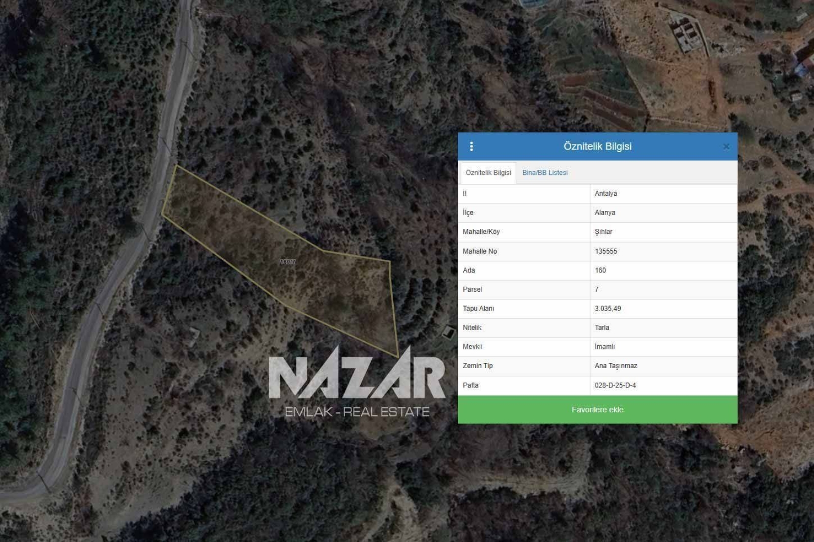 3.035 m2Alanya Şıhlar Mahallesi’nde bulunan 160 ada 7 parsel tek tapulu tarla satılıktır. 3.035 m² büyüklüğündeki taşınmaz, Alanya şehir merkezine yaklaşık 24 km mesafede yer almakta olup köy yerleşim alanı içerisindedir. Yol, elektrik ve su altyapısı mevcut olup ulaşım sorunsuzdur.