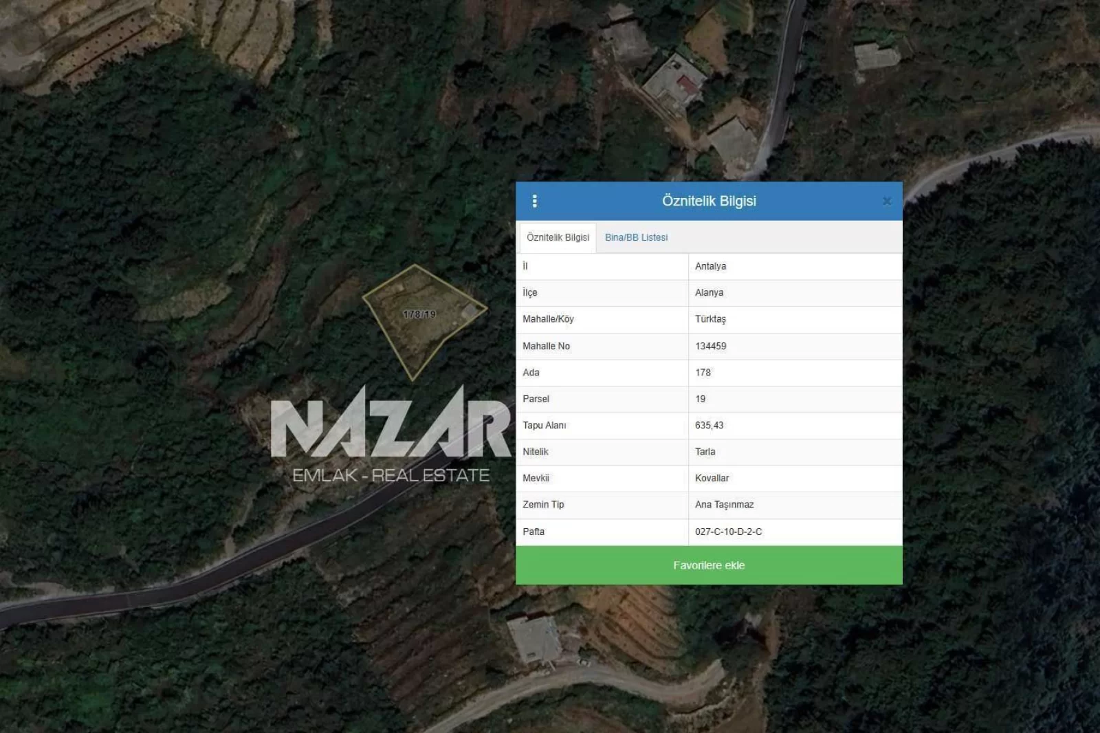 635 m2Alanya Türktaş Mahallesi’nde, Alanya şehir merkezine yaklaşık 30 km mesafede yer alan 635 m² büyüklüğündeki bu tarla köy yerleşim alanı içerisinde konumlanmaktadır. Arazi içerisinde küçük bir çiftçi kulübesi ve sulama havuzu bulunmakta olup, 3 yaşında 25 adet zeytin ağacı ve çeşitli meyve ağaçları mevcuttur. Doğa manzaralı olan tarla az harfiyatlı olup 3 parça maldan dan oluşmakta ve kaynak suyu bulunmaktadır.