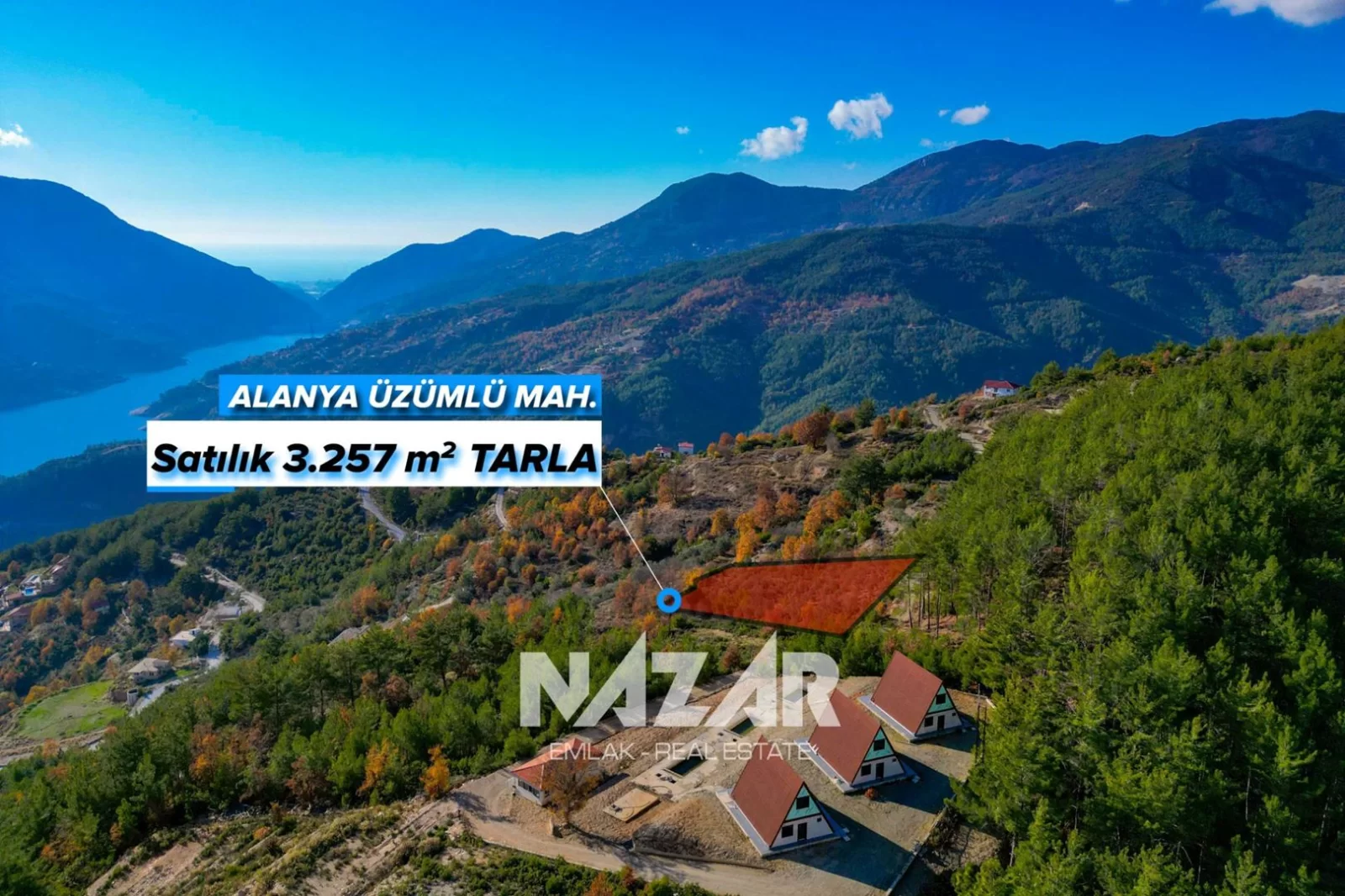 3.257 m2Alanya şehir merkezine 25 km mesafede bulunan Üzümlü Mahallesi’nde, baraja yakın konumda yer alan bu tarla 3.257 m² büyüklüğündedir. Doğa manzaralı ve az eğimli olan tarla, 141 ada 51 parsel tapu bilgilerine sahiptir. Köy yerleşim yeri içerisinde bulunmakta olup yol, su ve elektrik sorunu yoktur; istenmesi halinde ev yapımına uygundur.