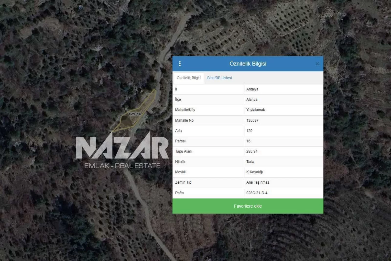 296 m2Alanya şehir merkezine 35 km mesafede, Yaylakonak Mahallesi’nde bulunan 296 m² büyüklüğündeki bu tarla; doğa manzaralı, yola yakın konumuyla yatırım ve tarımsal kullanım için uygundur. Tapu bilgileri 129 ada 16 parsel olarak kayıtlıdır.