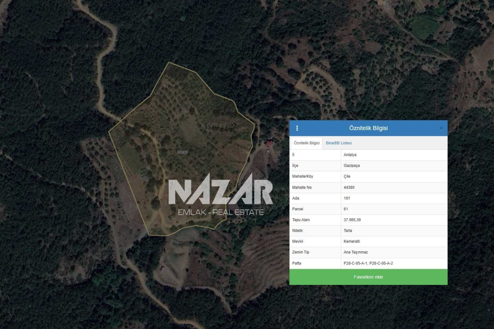 37.085 m2Gazipaşa Çile Mahallesi’nde yer alan bu 37.085 m² genişliğindeki tarla, anayola yakın konumu ve Gazipaşa merkeze yaklaşık 20 km mesafesiyle dikkat çekmektedir. 101 ada 61 parsel tapu bilgisine sahip olan arazide, 50 m² tek katlı, eşyalı taş ev bulunmaktadır. Taş evin elektrik ihtiyacı çatısında bulunan 36 adet güneş paneli ile karşılanmakta olup enerji depolama sistemi mevcuttur. Su sorunu bulunmayan tarlada üzüm asması ve çeşitli meyve ağaçları yer almakta, arazi gün boyu güneş almaktadır.