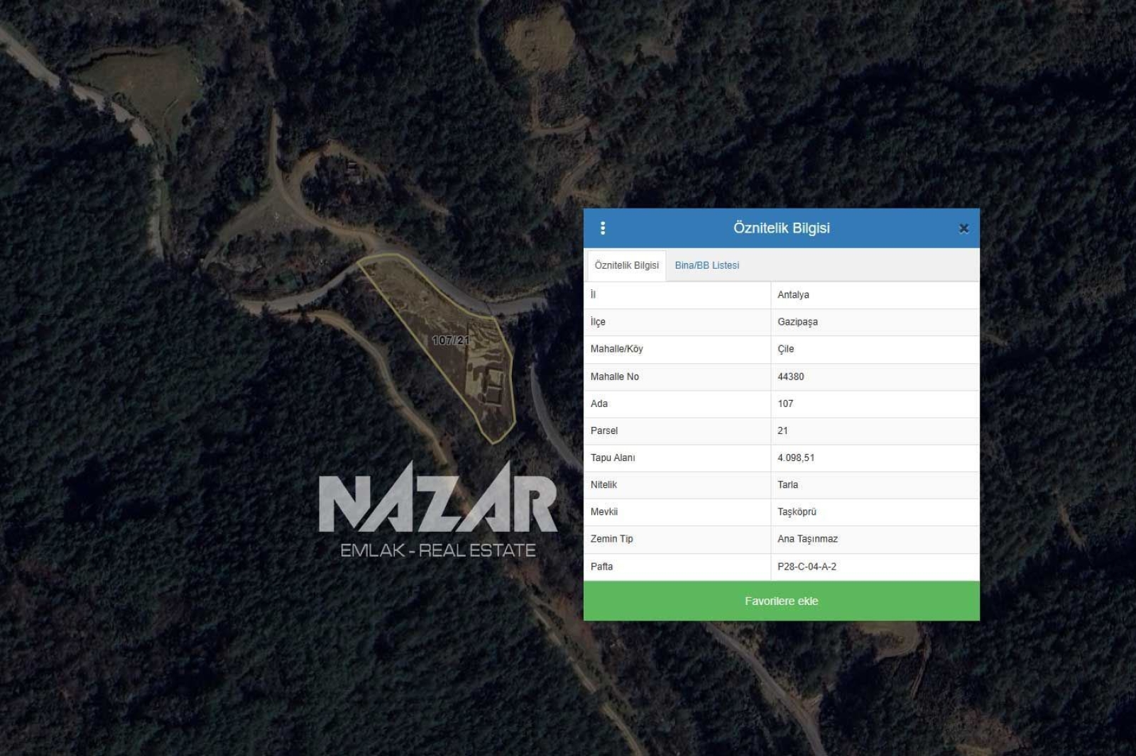 4.099 m2Gazipaşa Çile Mahallesi’nde yer alan bu 4.099 m² genişliğindeki tarla, 107 ada 21 parsel tapu bilgilerine sahiptir. Yola sıfır ve dere kenarında konumlanan arazi, Gazipaşa merkeze yaklaşık 10 km mesafededir. Köy yerleşim alanına yakın konumu ile ulaşımı kolay ve kullanım açısından avantajlıdır. Elektrik ve su altyapısı sorunsuzdur.