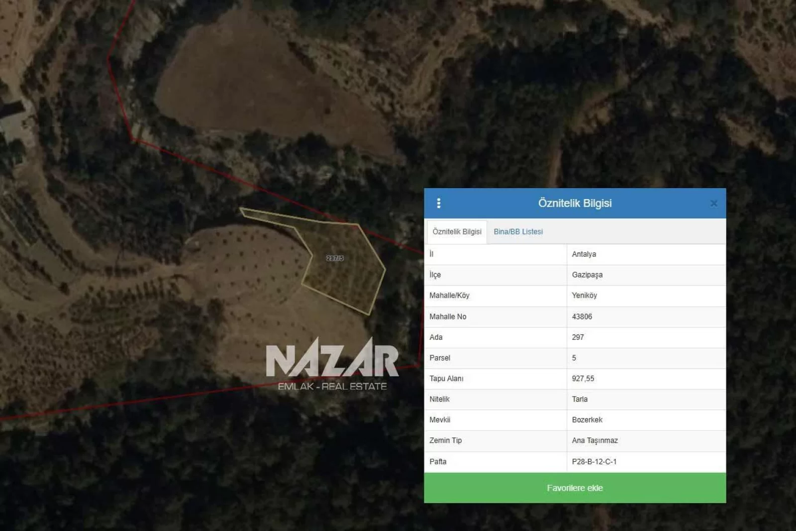 928 m2Gazipaşa Yeniköy Mahallesi’nde, 297 ada 5 parselde yer alan 928 m² büyüklüğündeki tarla satışa sunulmuştur. Anayola yakın konumda olan tarla, Gazipaşa ilçe merkezine 15 km mesafede yer almakta olup, ulaşım açısından oldukça avantajlıdır. Köy yerleşim alanı içinde bulunan ve az eğimli bir yapıya sahip olan tarla, hem hobi bahçesi olarak kullanılabilir hem de yatırım amaçlı değerlendirilebilir.